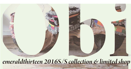 ![]() ![]() emeraldthirteen 2016S/S collection & limited shop 「Obi」 2016春夏新作コレクションを先行予約できます。 limited shop では、emeraldthirteen × TAO XIANG UOO のコラボレーションアクセサリー、 表情を変えずーと長く着れる子供服、 emeraldthirteenのkids line「tilia miqueliana」では、新しいリサイクルの提案を。 その他、今すぐ着用できる秋冬アイテムを期間限定で販売いたします。 どなたでもご来場いただけますので、お気軽にお立ち寄りください。 ショップバイヤー様は事前にアポイント連絡を頂きたくお願い申し上げます。 080-4245-1152(藤井)